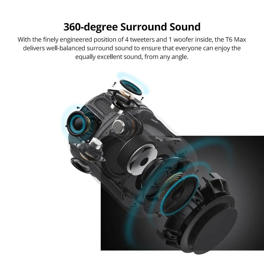 The Tronsmart T6 Max is a portable speaker made for those who take sound seriously. With 60W of real power and 360° sound, it delivers full, detailed bass that fills the entire room, whether at parties or during a relaxing moment. And the craziest thing? It has 4 tweeters, 1 woofer and no less than 8 passive radiators — it's sound you can hear and feel , even at low volumes.