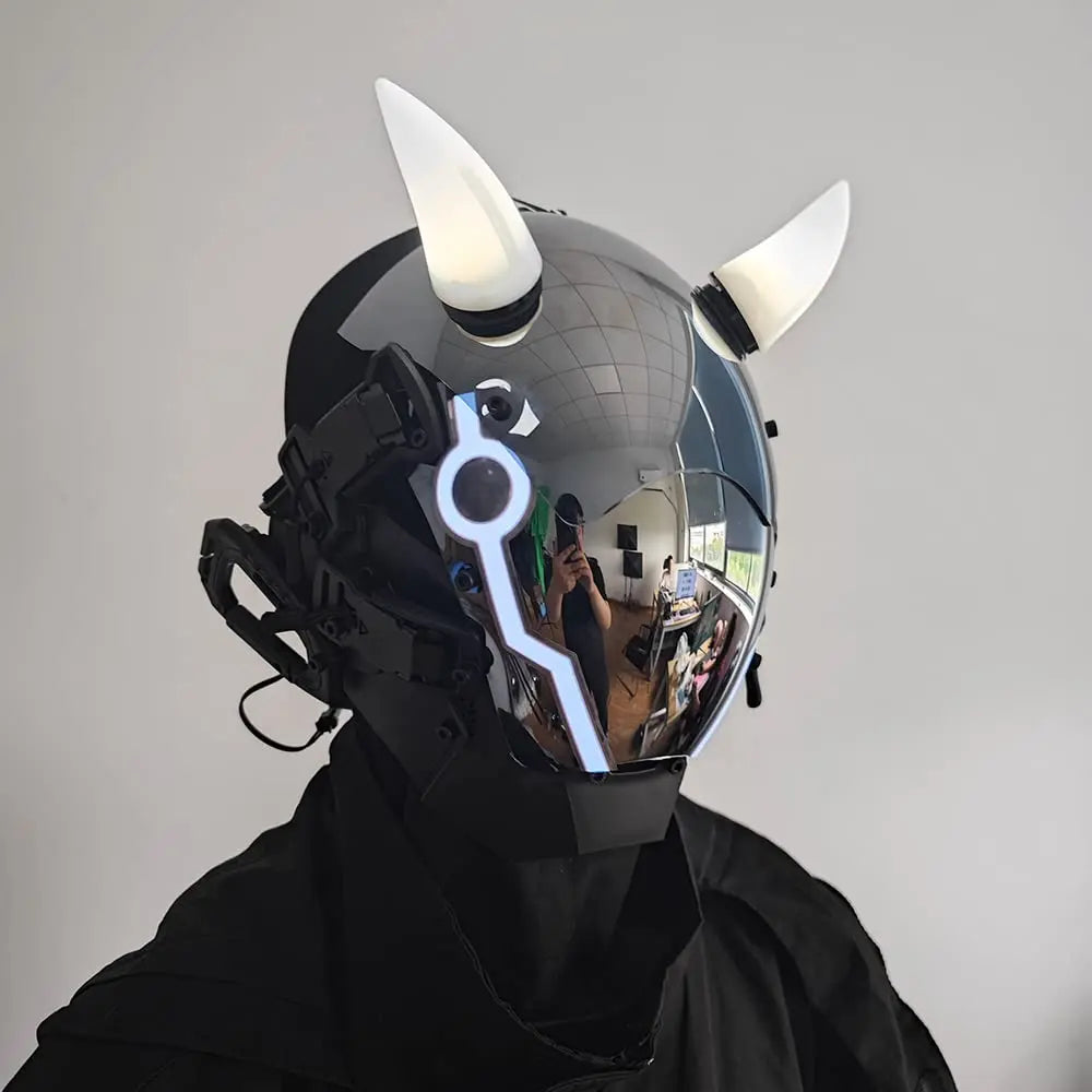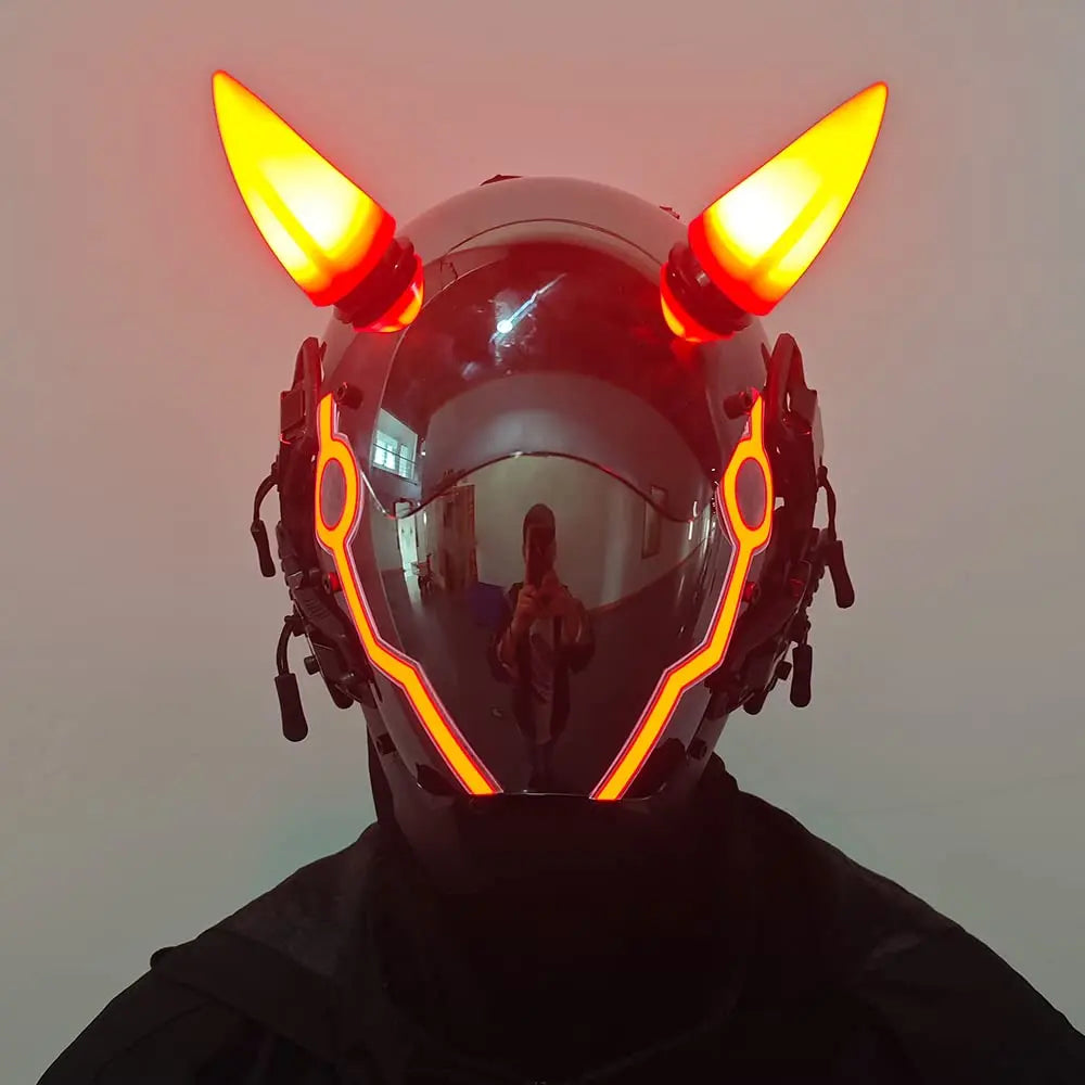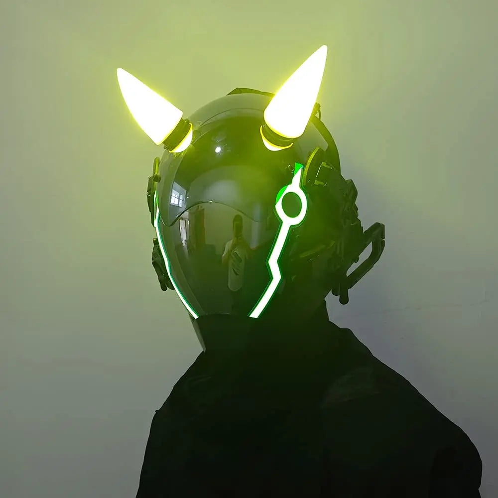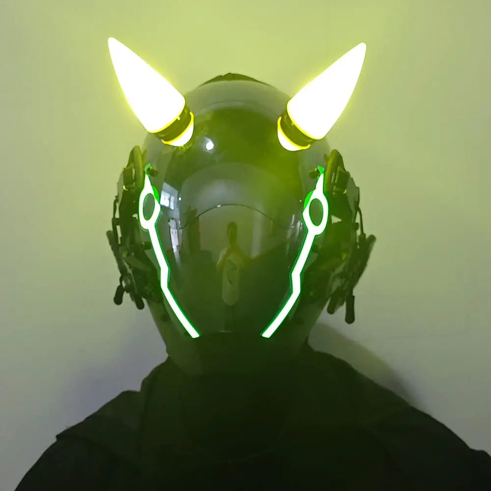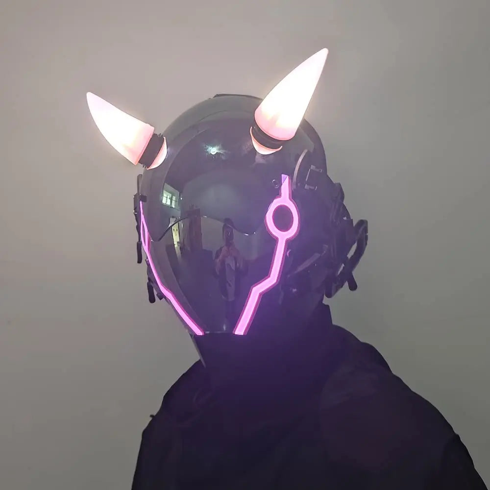 If you’re looking for a mask that combines aggressive looks, striking lights, and a demonic futuristic touch, the Cyberoni is the ultimate choice. With its illuminated ox horns and sturdy techwear construction, it looks like it’s straight out of a cyberpunk anime or a rave in the depths of Neo-Tokyo.
