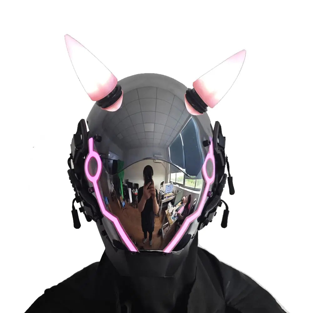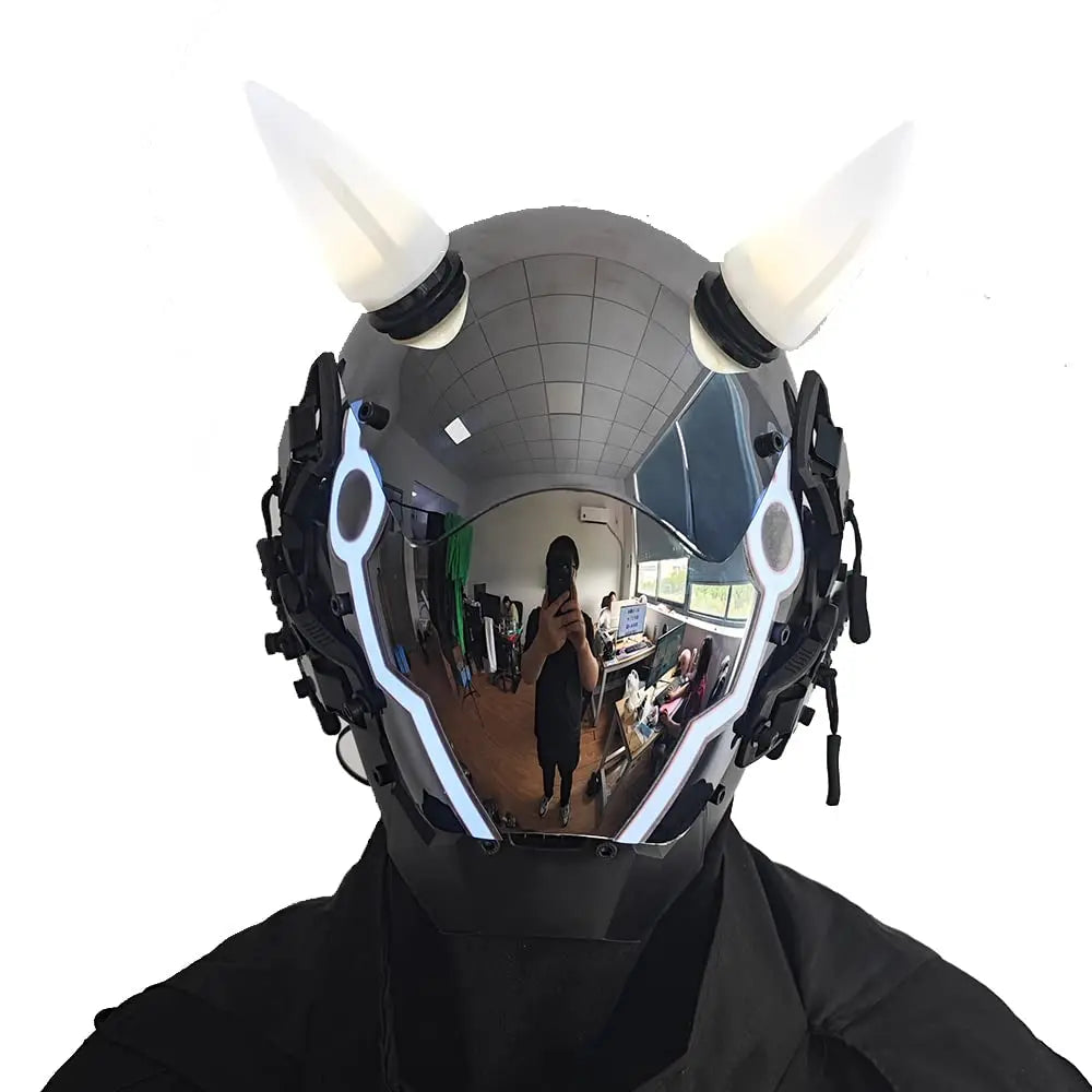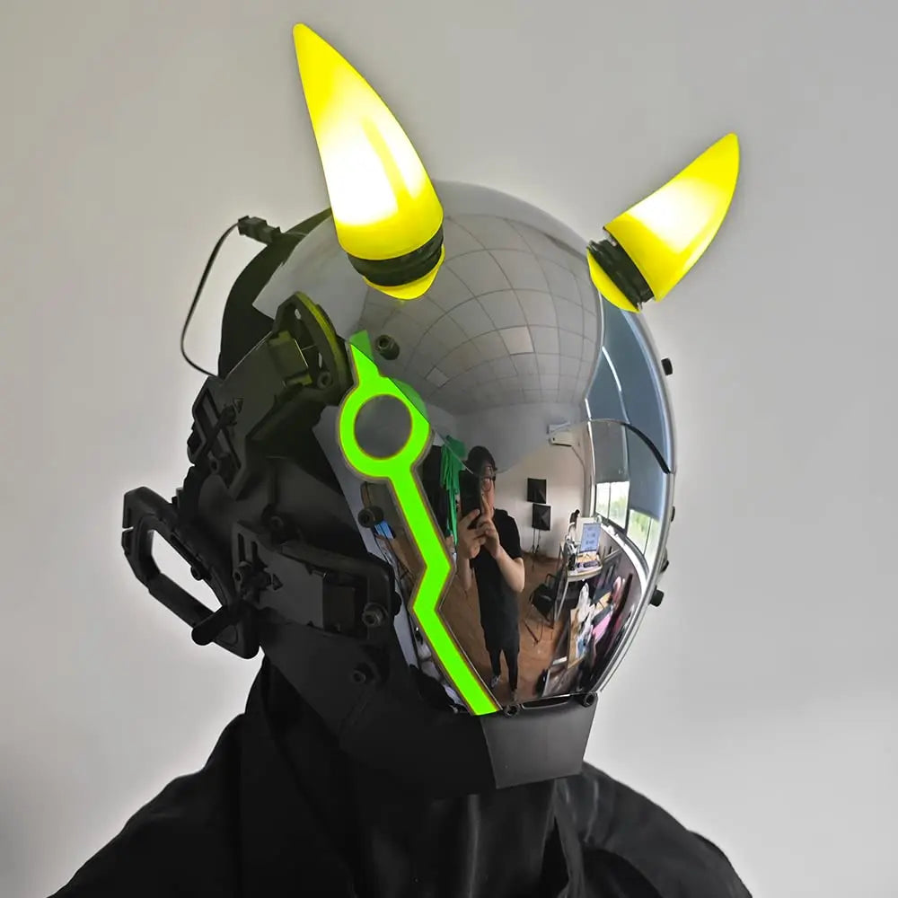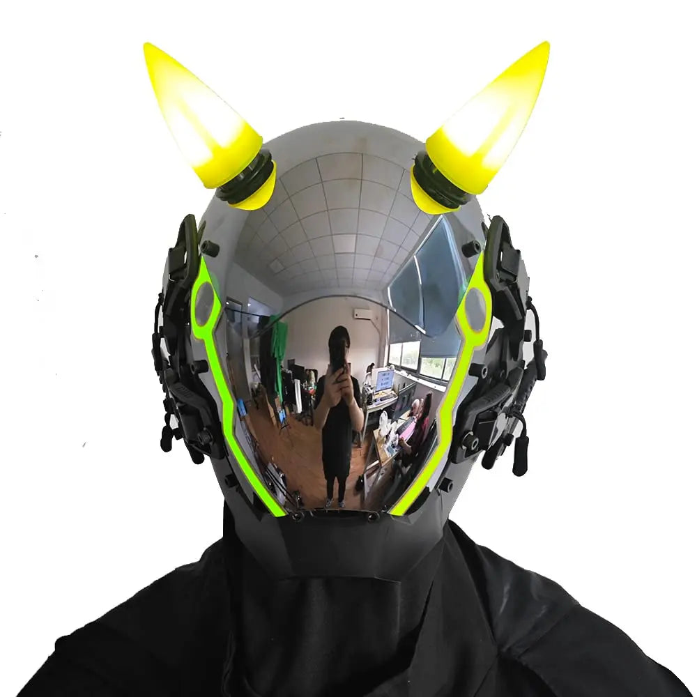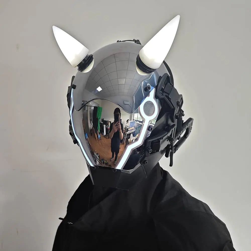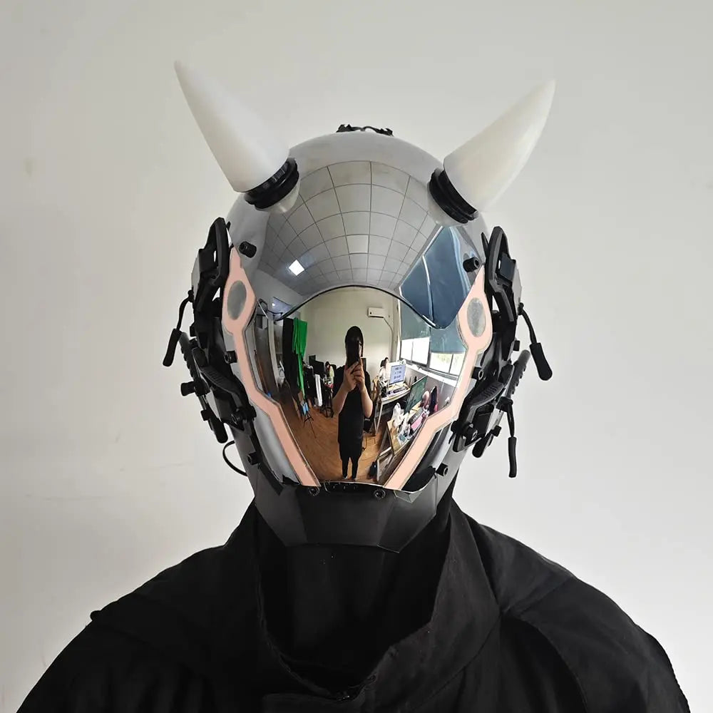 If you’re looking for a mask that combines aggressive looks, striking lights, and a demonic futuristic touch, the Cyberoni is the ultimate choice. With its illuminated ox horns and sturdy techwear construction, it looks like it’s straight out of a cyberpunk anime or a rave in the depths of Neo-Tokyo.