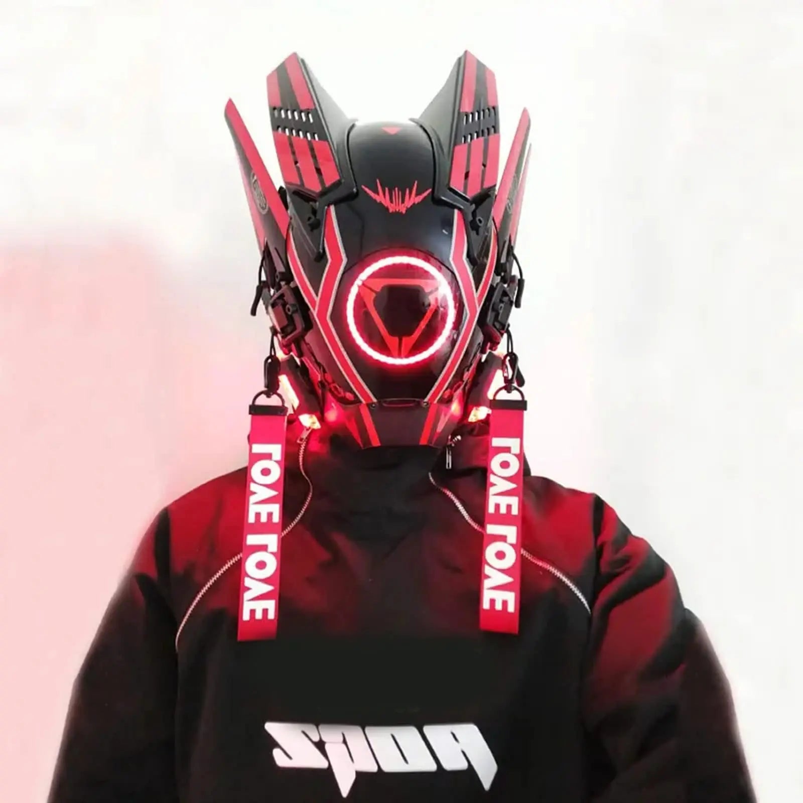 A helmet that looks like it came straight out of a futuristic manga: the built-in LED brings the look to life, making the mask a striking presence in any dark or neon-lit environment. -