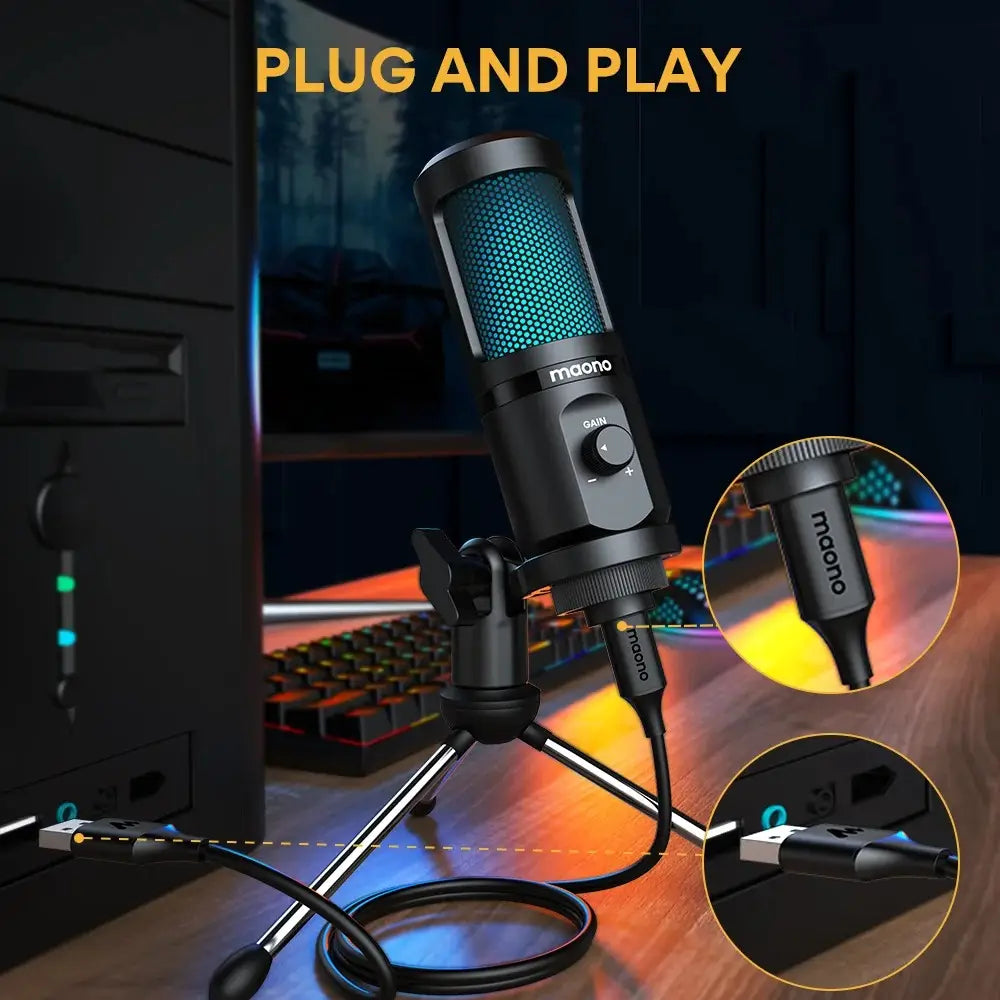 The MAONO AU-PM461TR is the ideal microphone for gamers, content creators and professionals looking for high-quality audio with a modern design. With stunning RGB lights, excellent pickup and wide compatibility, it meets the needs of recording, live streaming and online meetings with style and efficiency.