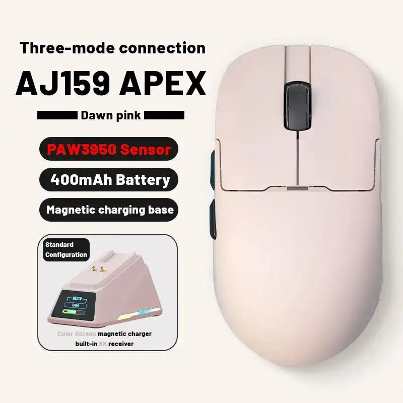The Ajazz AJ159 APEX mouse is a high-performance device aimed at gamers seeking precision and versatile connectivity. Equipped with the custom PAW3950 optical sensor, the mouse offers three connection modes — 2.4GHz wireless, Bluetooth, and wired USB-C — ensuring flexibility for different usage styles. With an impressive response rate of up to 8000Hz in wireless mode, it provides a smooth and lag-free gaming experience.