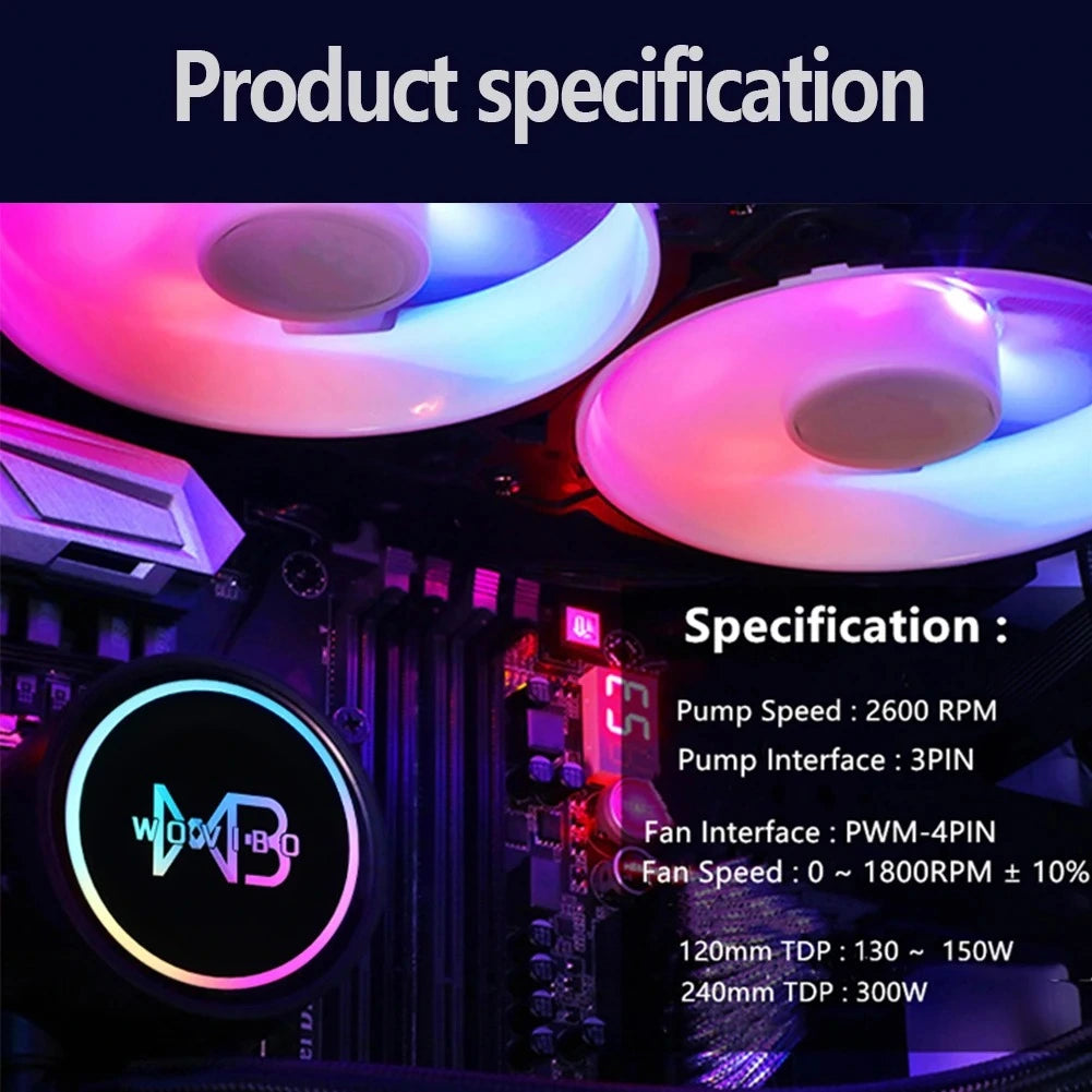 Wovibo's WBJY AIO Watercooler is an all-in-one liquid cooling system for CPUs, ideal for keeping your processor's temperature under control, offering support for a wide range of Intel and AMD sockets. With RGB/ARGB fans, it provides an attractive and efficient aesthetic, ideal for gaming and professional PC setups.
