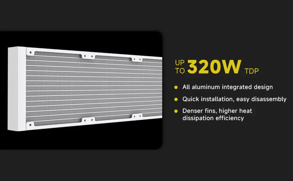 - 360mm aluminum radiator: Dimensions 397x120x27mm, high thermal efficiency.