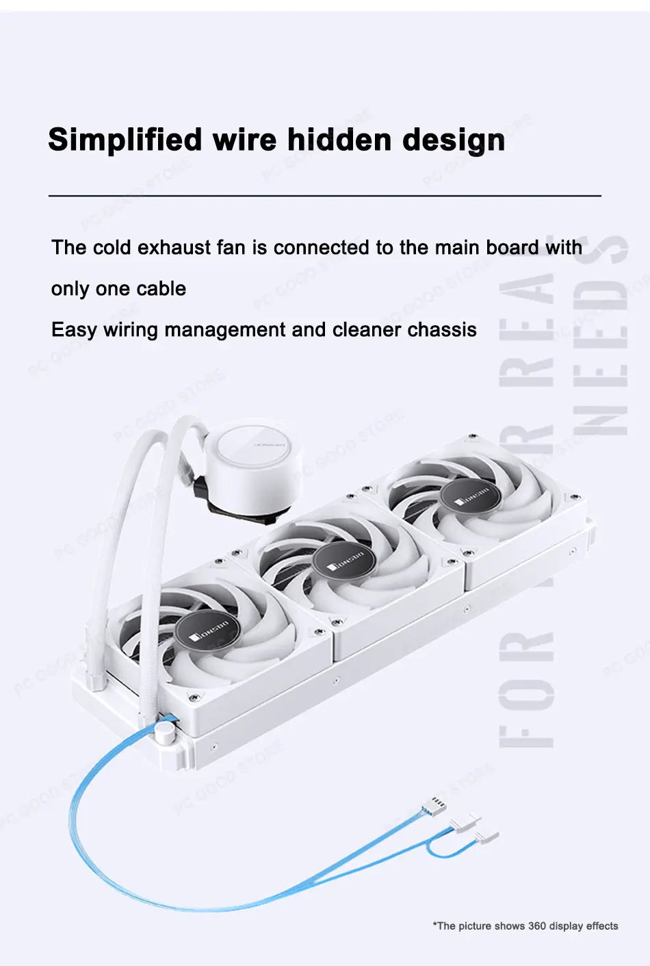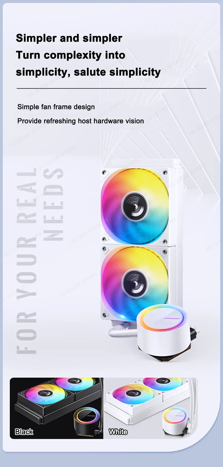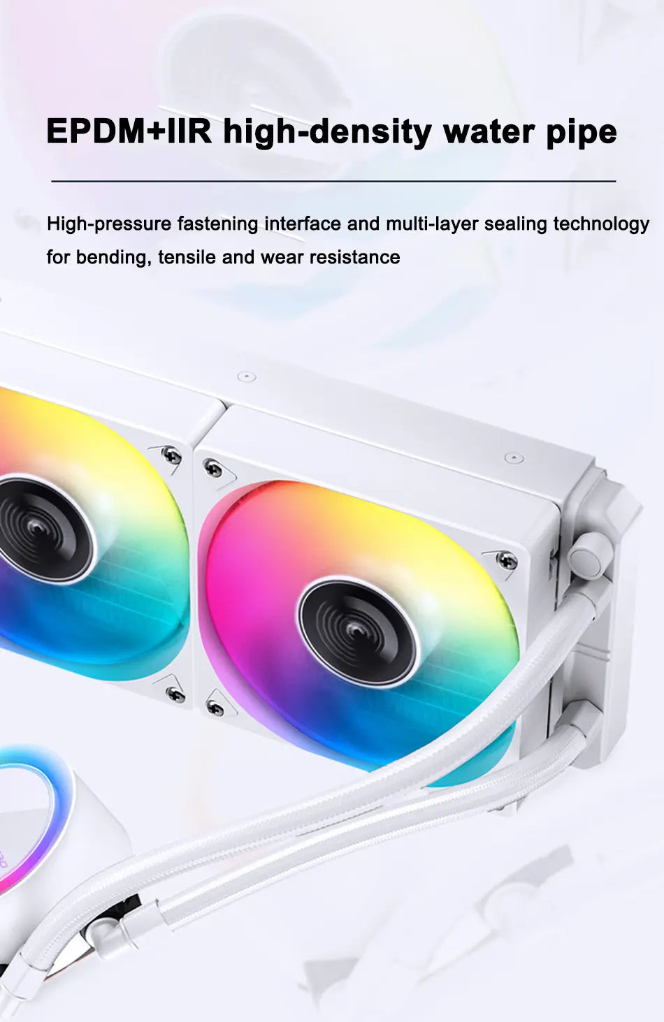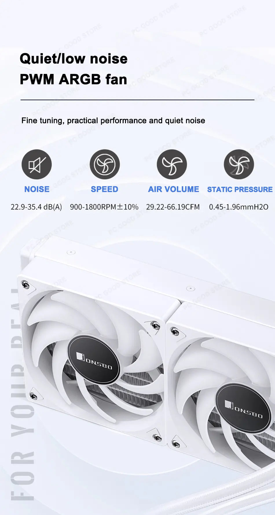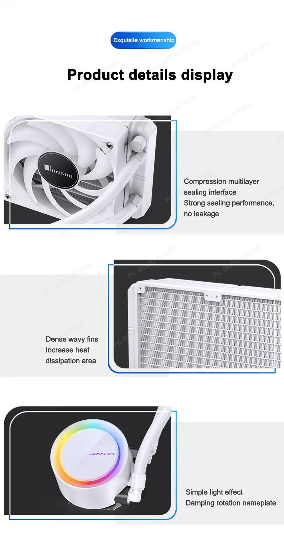- Quiet operation: low-noise fans and pump with less than 30dB(A), ideal for setups that require silence.