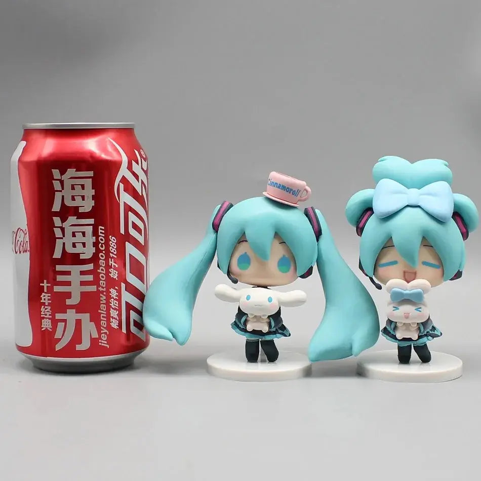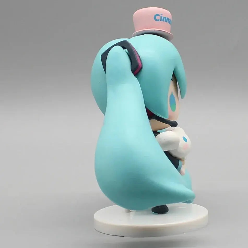 Design kawaii e colecionável: Combinação encantadora da Hatsune Miku com o Cinnamoroll em versão estilizada.