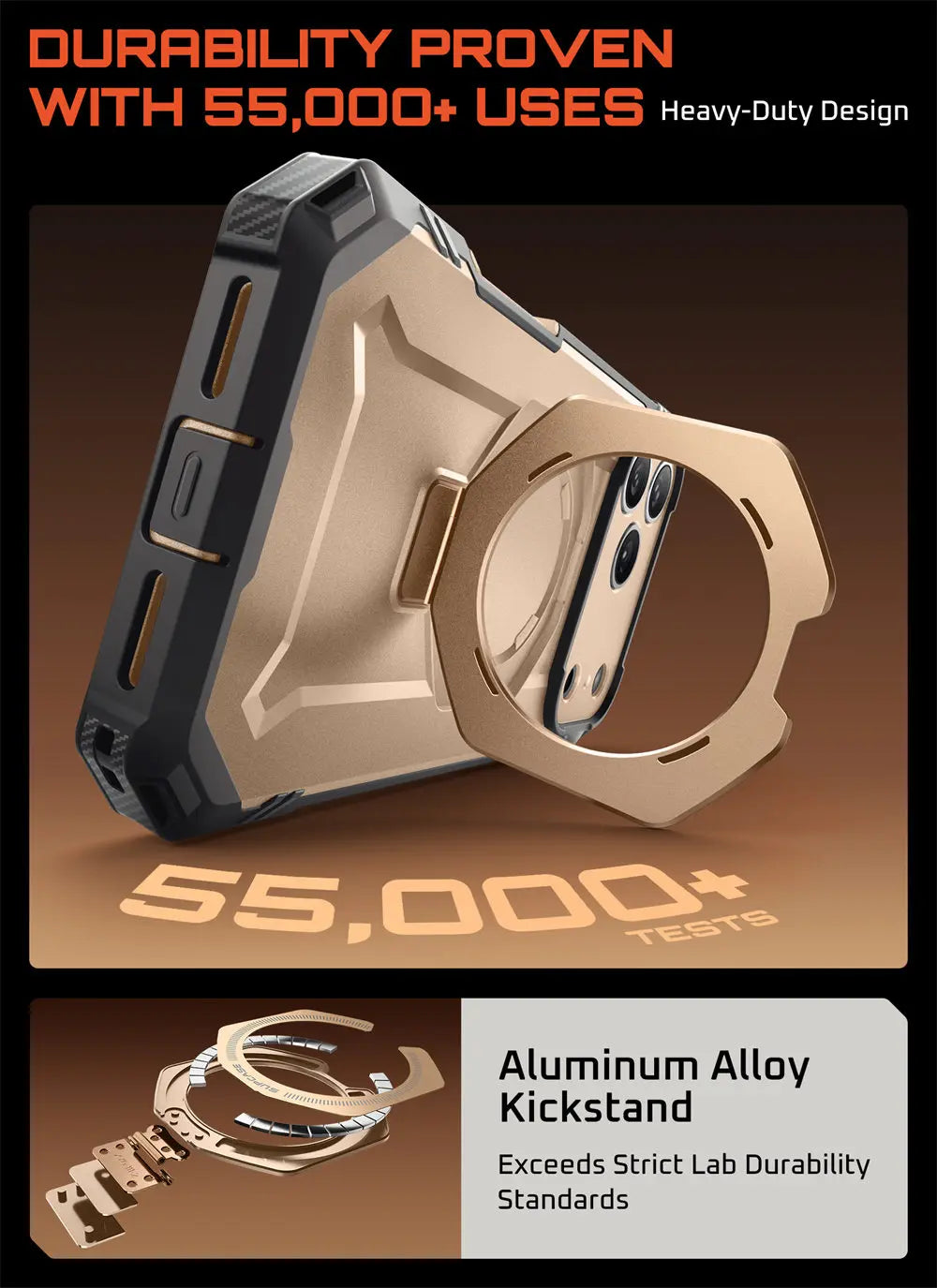 • Proteção de nível militar: certificação MIL-STD-810H-516.8, suportando quedas de até 4,5 m (15 pés) graças à construção híbrida TPU + PC e aos airbags de canto absorventes de impacto.