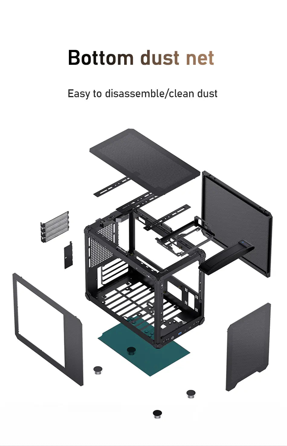 - Boa refrigeração: suporte para até 5 fans de 120mm ou 1x 140mm + 3x 120mm, além de filtros de poeira no topo e na parte inferior.