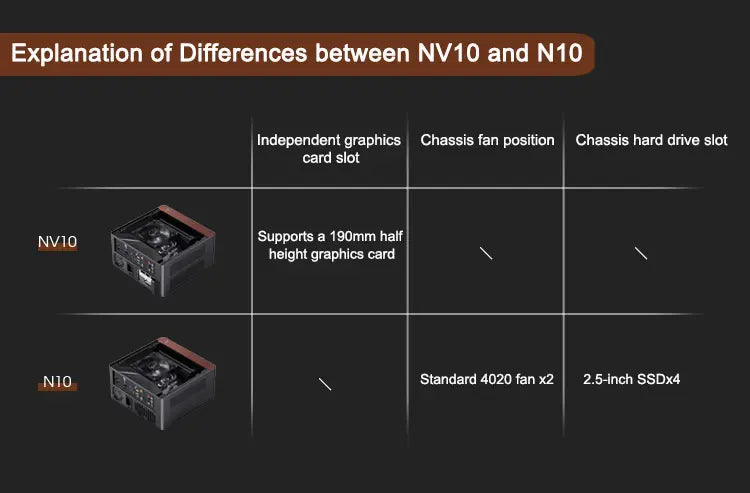 O modelo N10 é voltado para quem deseja armazenamento robusto, já que suporta até 4 SSDs de 2,5" em apenas 2 litros de volume. Já o NV10 aposta em expansão gráfica, com suporte para placas de vídeo de meia altura de até 190mm.