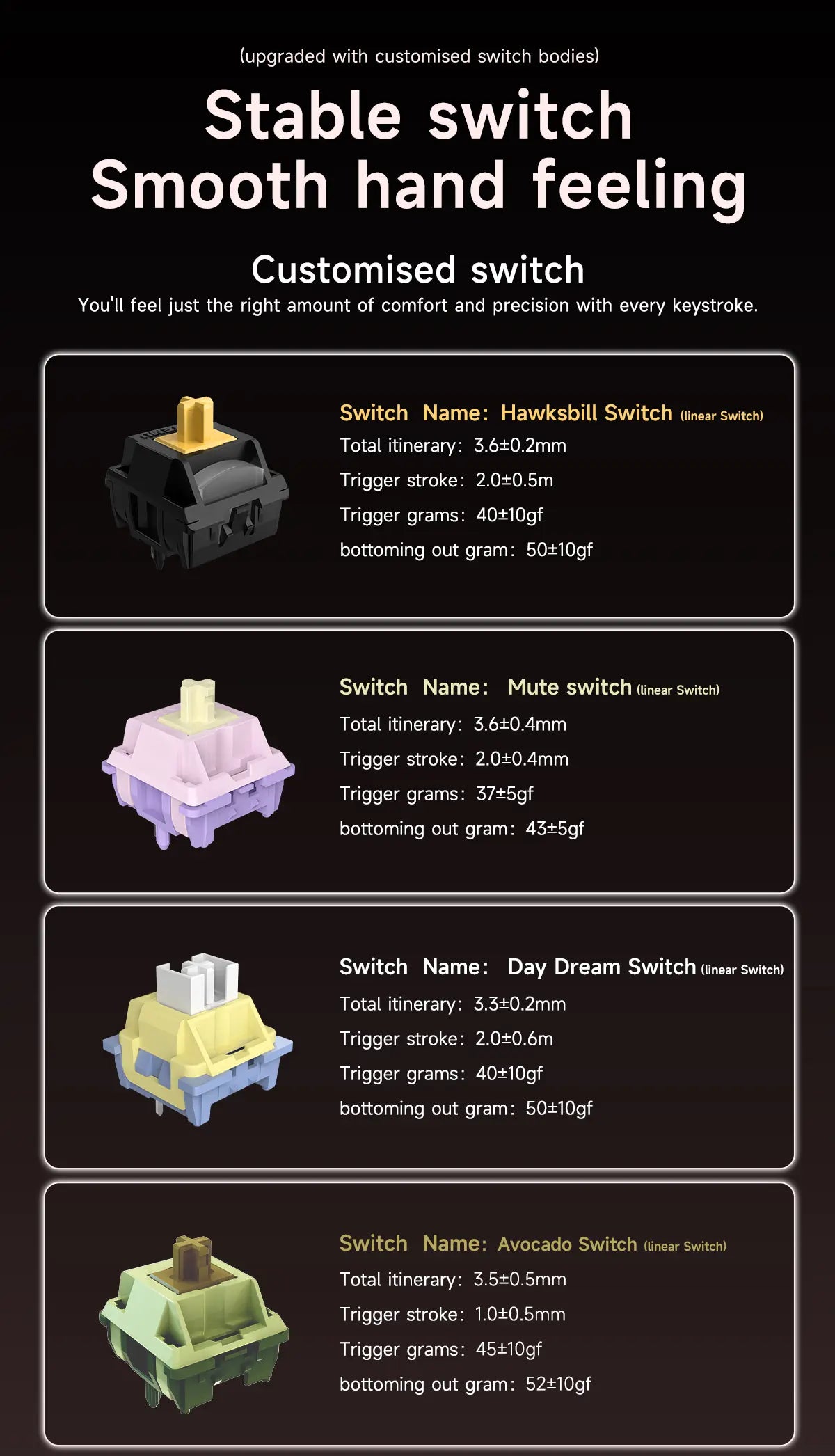 Troque os switches sem solda, facilitando upgrades ou mudanças de estilo de digitação conforme sua preferência.