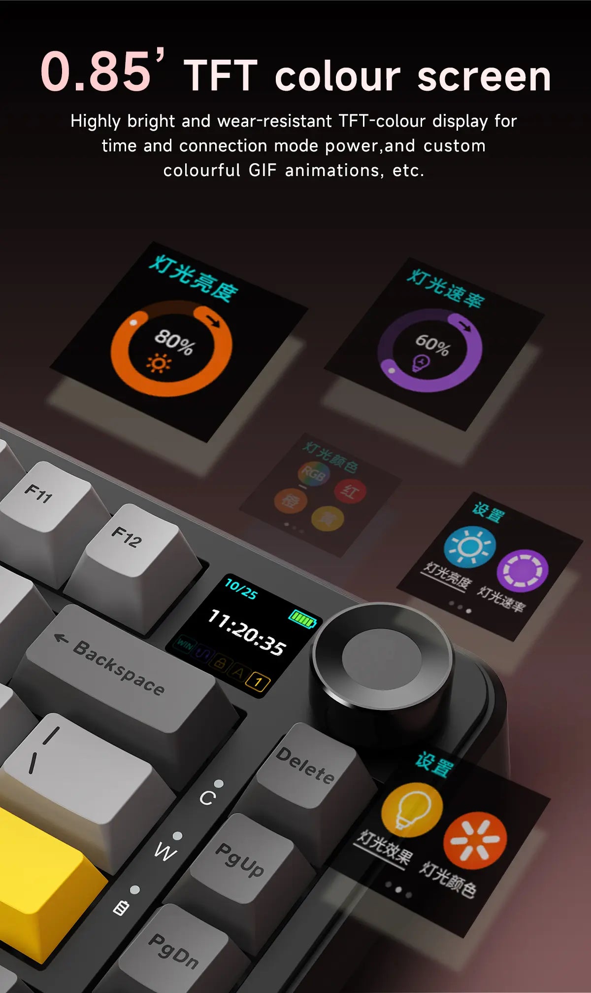 Exiba informações úteis como status de conexão, nível da bateria, modo ativo e muito mais, tudo direto no teclado.