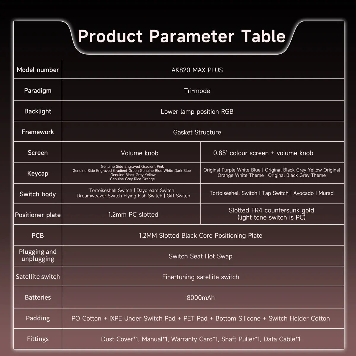 O Ajazz AK820 MAX Plus é um teclado mecânico gamer compacto, moderno e cheio de recursos para quem quer desempenho com estilo. Com modo trimode (com fio, 2.4GHz sem fio e Bluetooth), bateria de longa duração e uma construção premium montada em junta, ele entrega uma experiência de digitação silenciosa, confortável e altamente personalizável — ideal para setups profissionais e gamers exigentes.