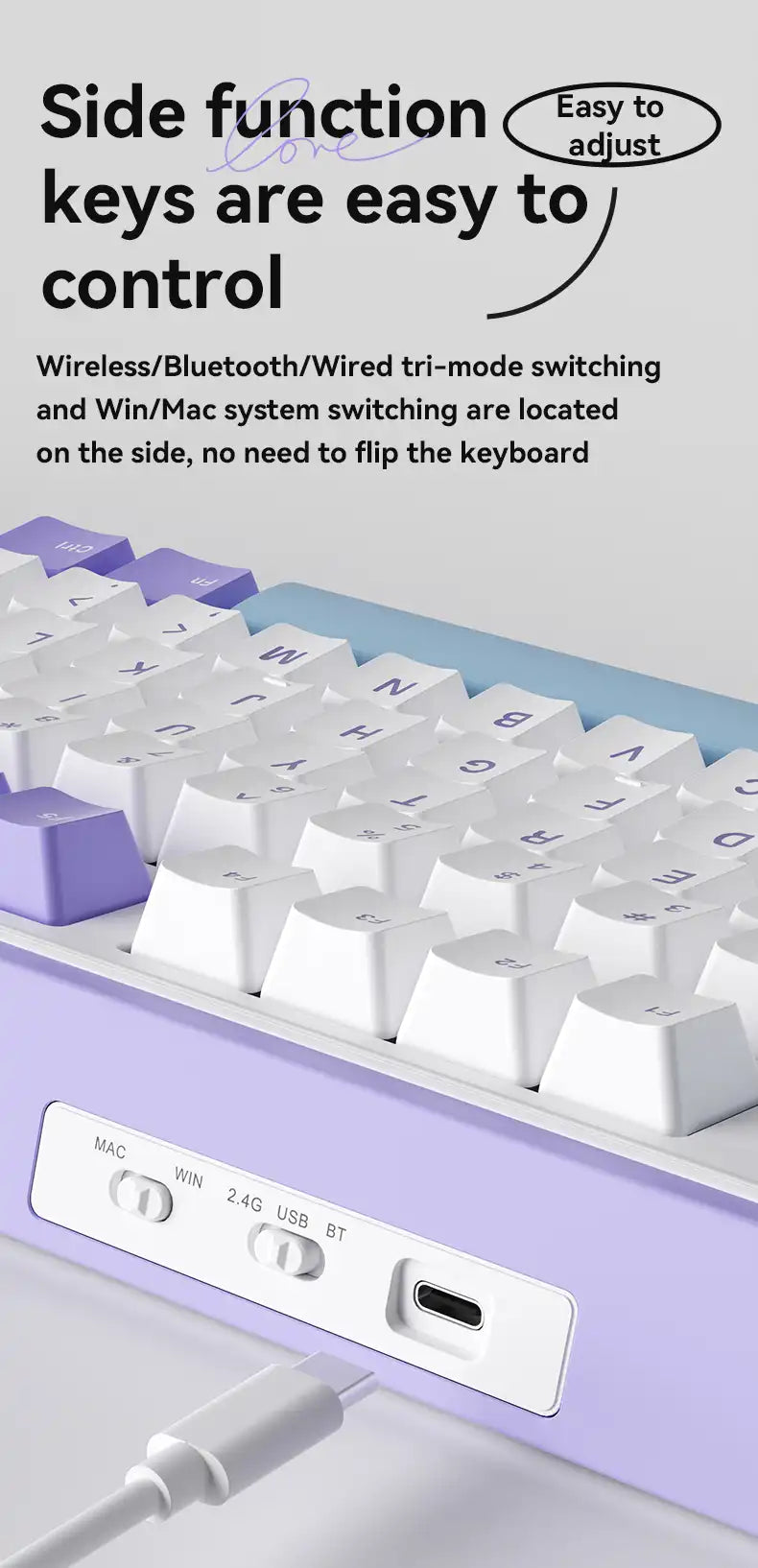 - Controle Multifuncional Lateral: Alterne entre modos de conexão e sistemas (Win/Mac) com switches laterais fáceis de acessar.