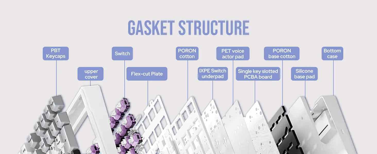 Combinação de espuma PORON, silicone e pads IXPE que garantem toque suave, som controlado e uma digitação premium. -