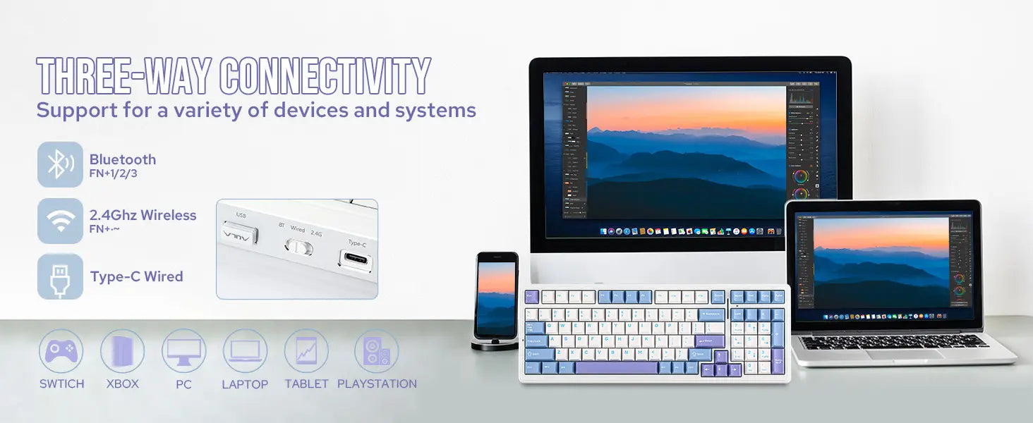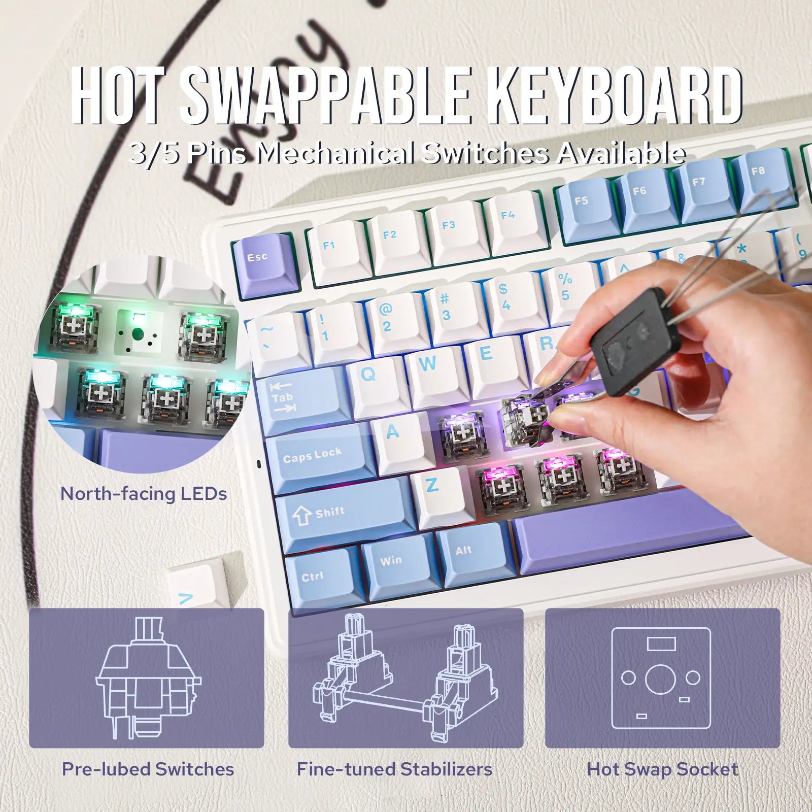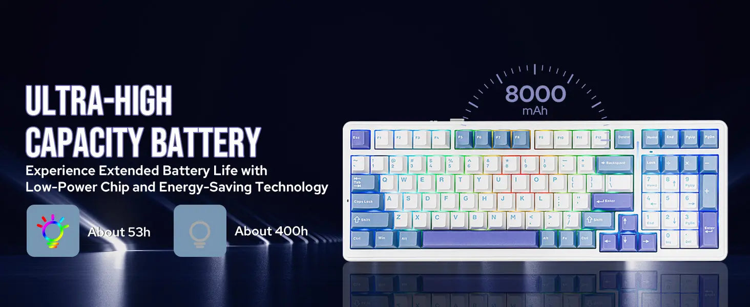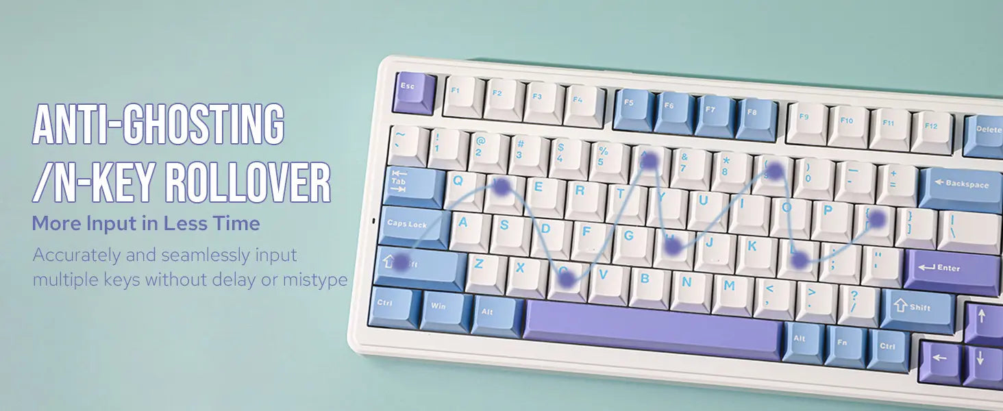 O EPOMAKER x AULA F99 é a definição de potência, conforto e versatilidade em um teclado mecânico sem fio. Ele une uma construção robusta com design gamer premium, pronto para longas batalhas e sessões de produtividade — seja no PC, Mac, tablet ou até celular. E o melhor: oferece uma experiência de digitação ultra responsiva graças à sua estrutura montada em junta e tecnologias de redução de ruído.