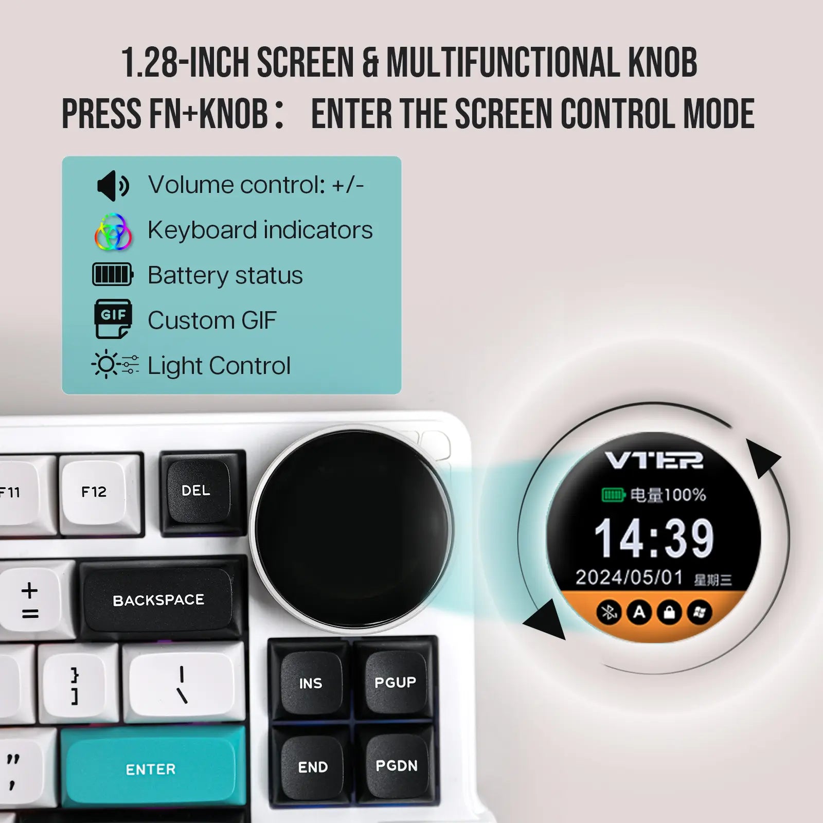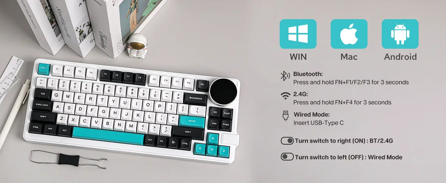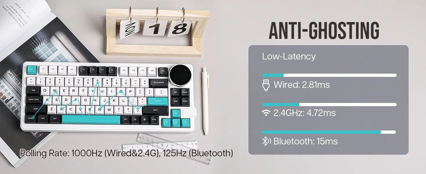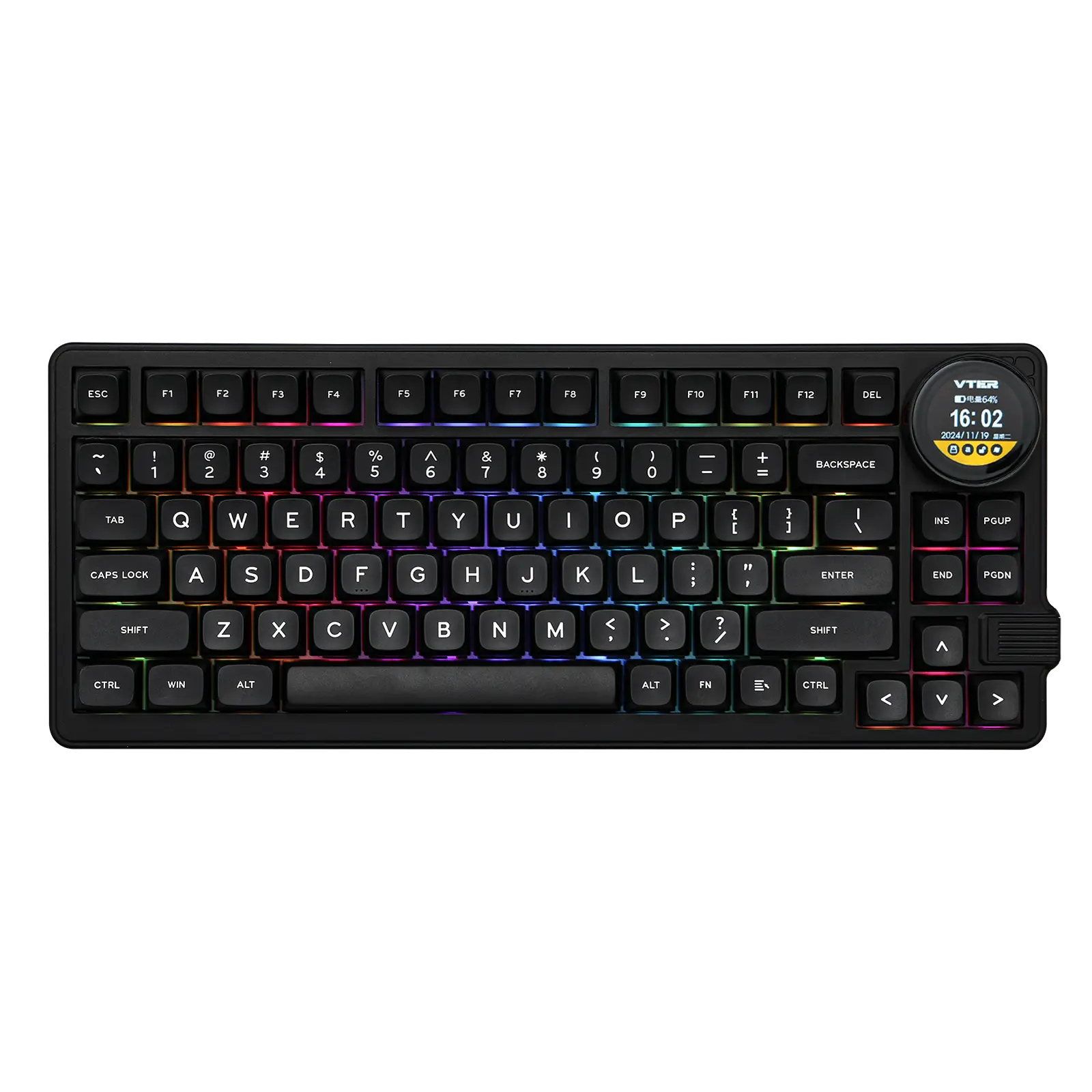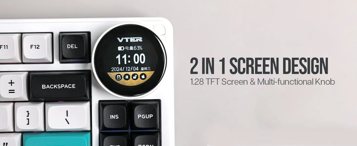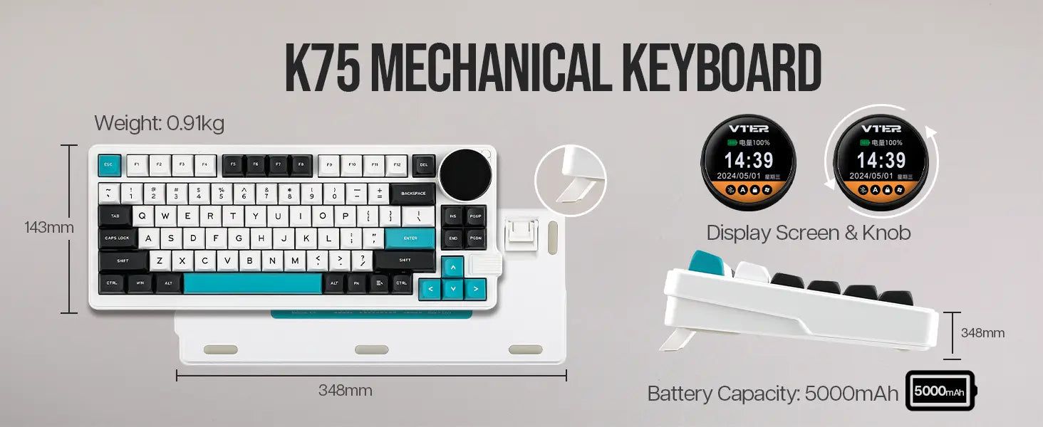 Um teclado 75% super funcional com um botão giratório que serve para ajustar volume, ver status de conexão, bateria e muito mais — direto no display embutido de 1,28". -