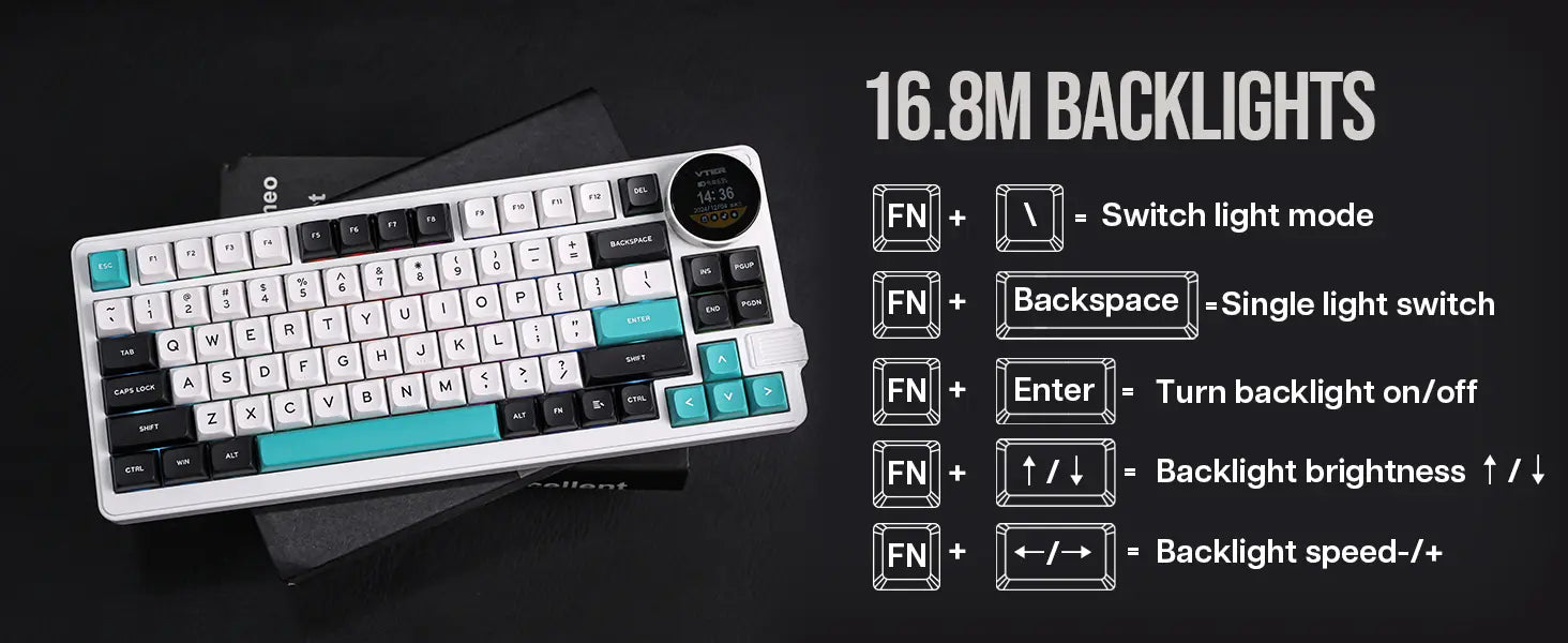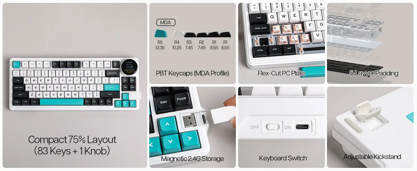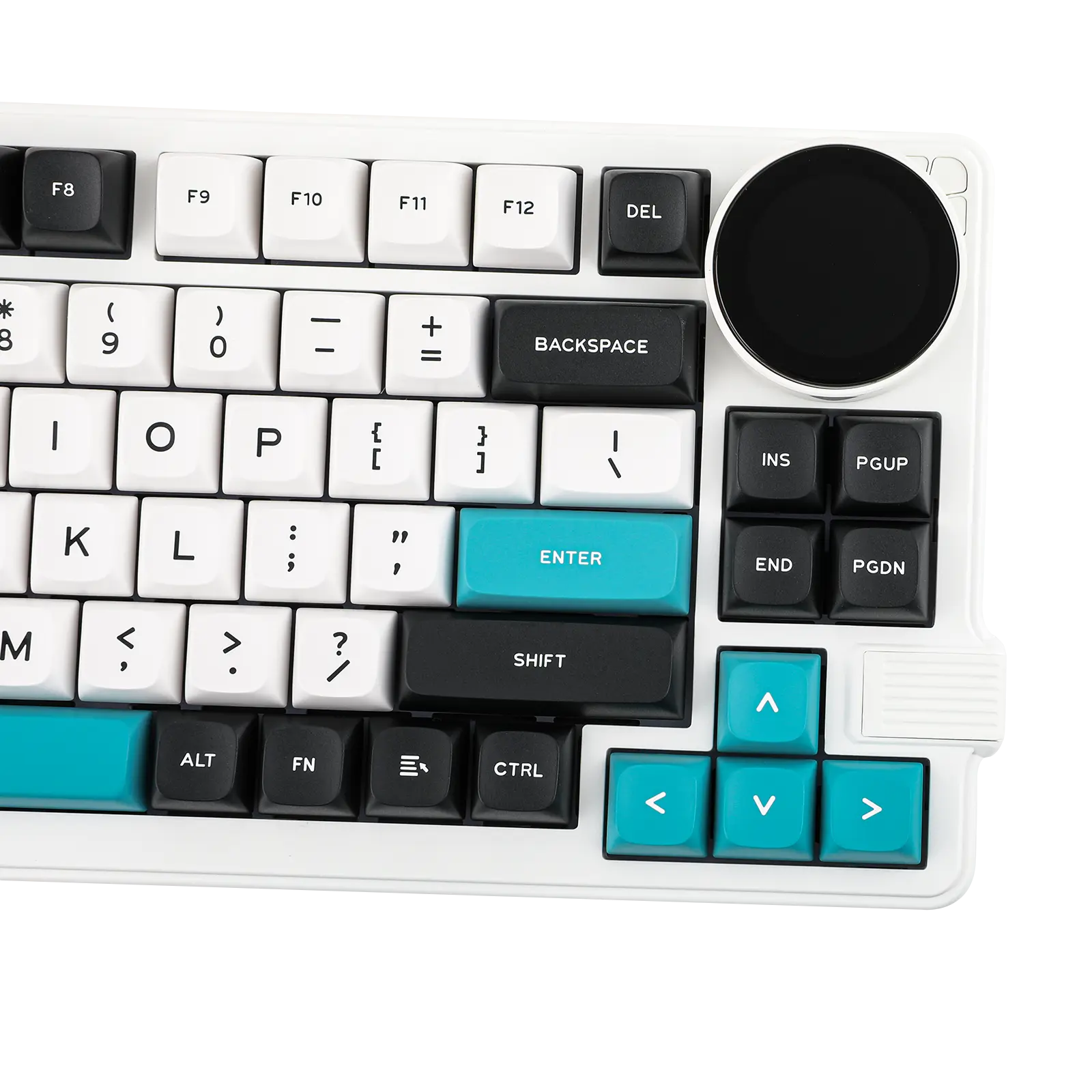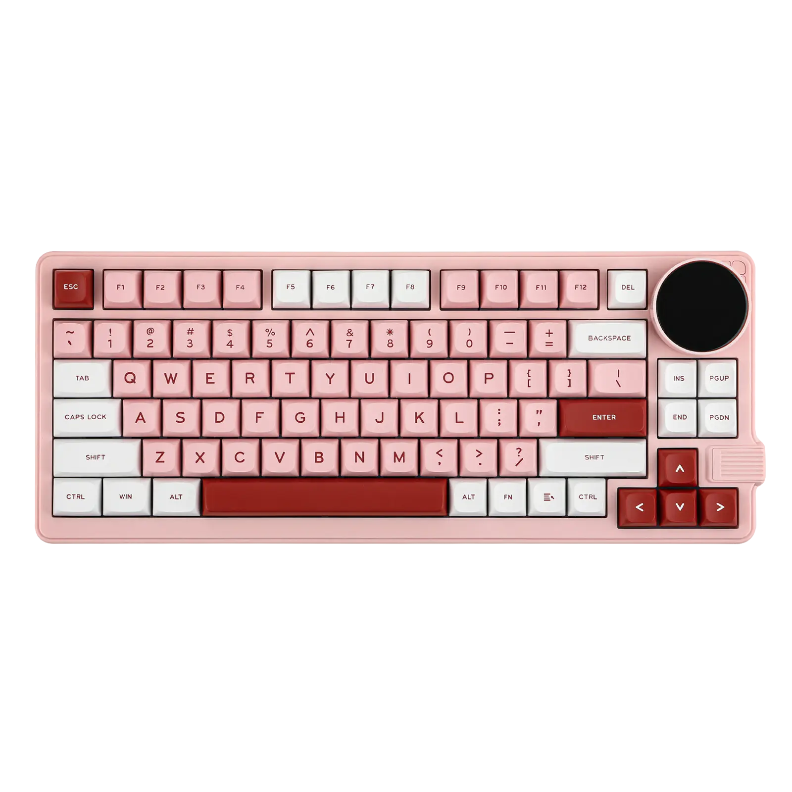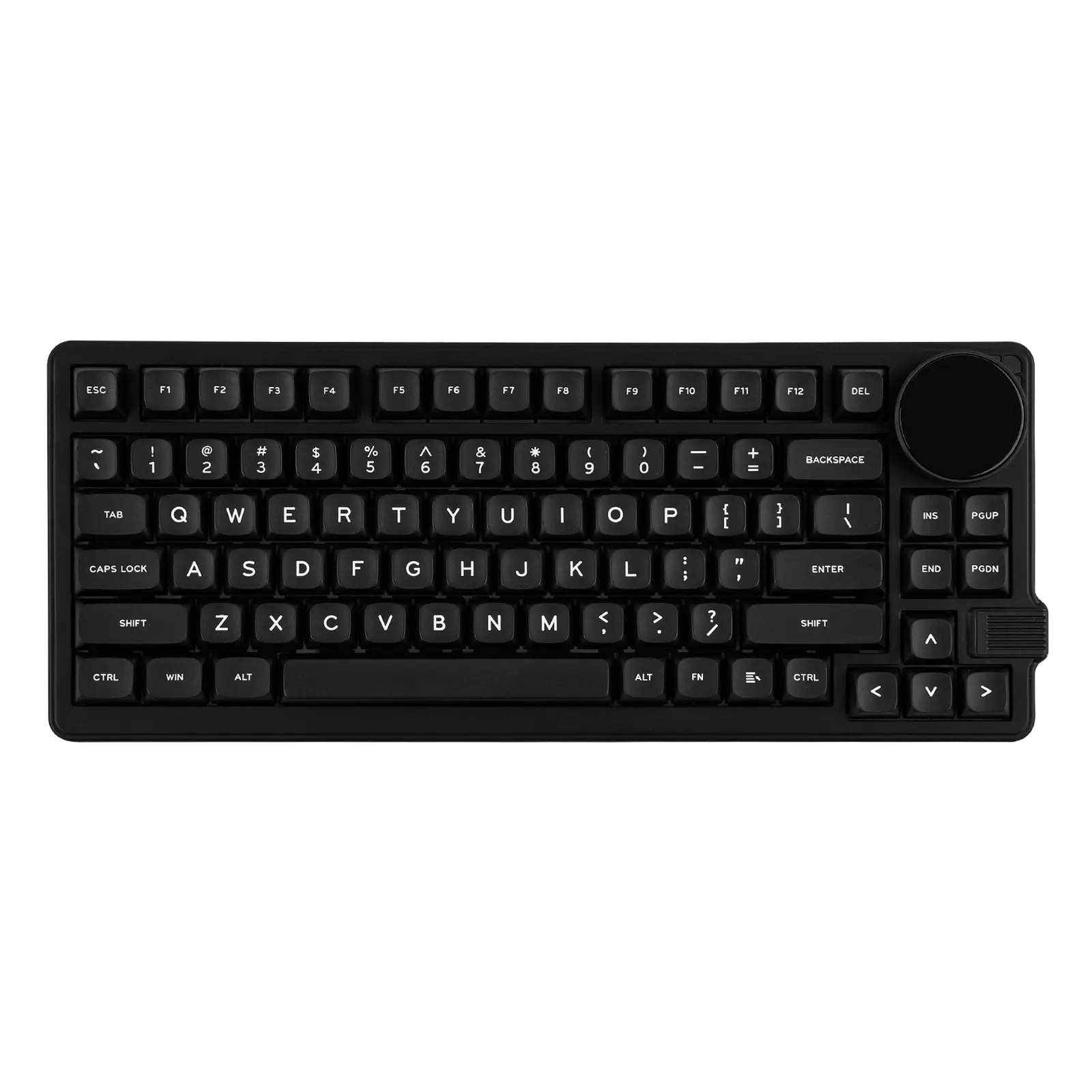 Um teclado 75% super funcional com um botão giratório que serve para ajustar volume, ver status de conexão, bateria e muito mais — direto no display embutido de 1,28". -