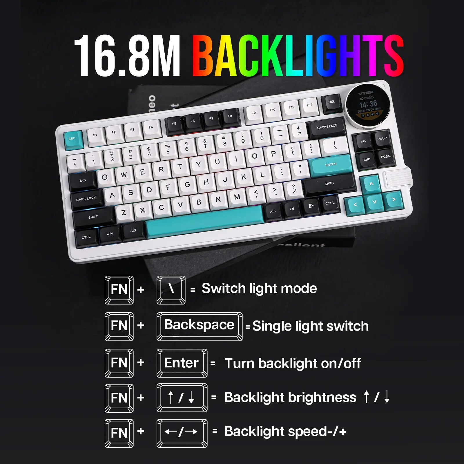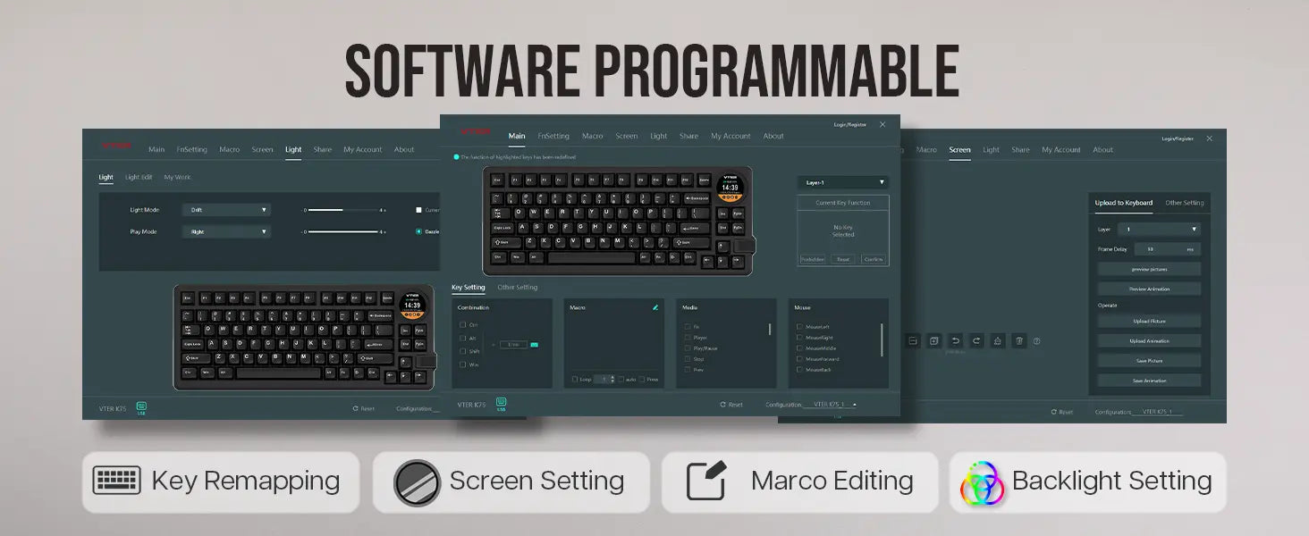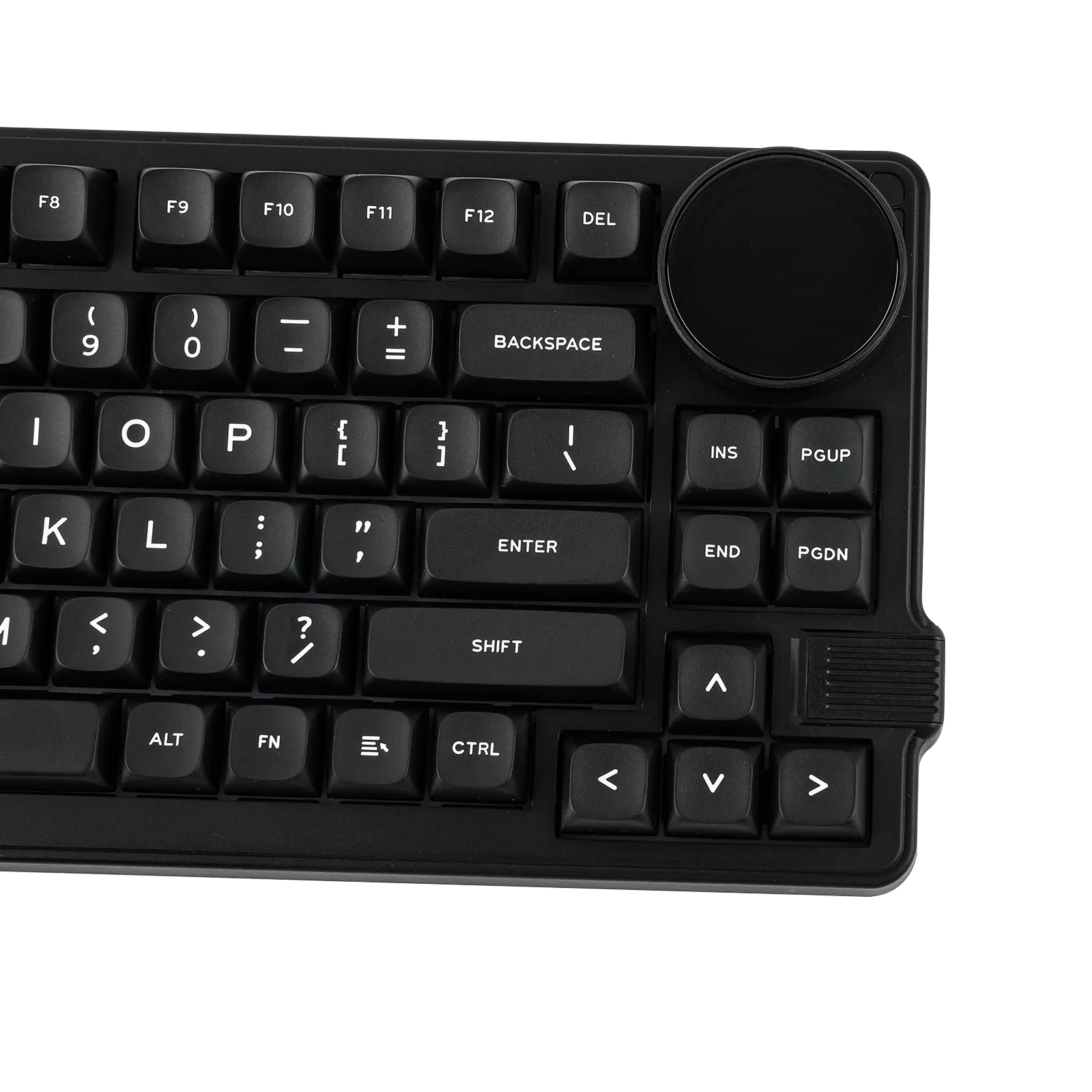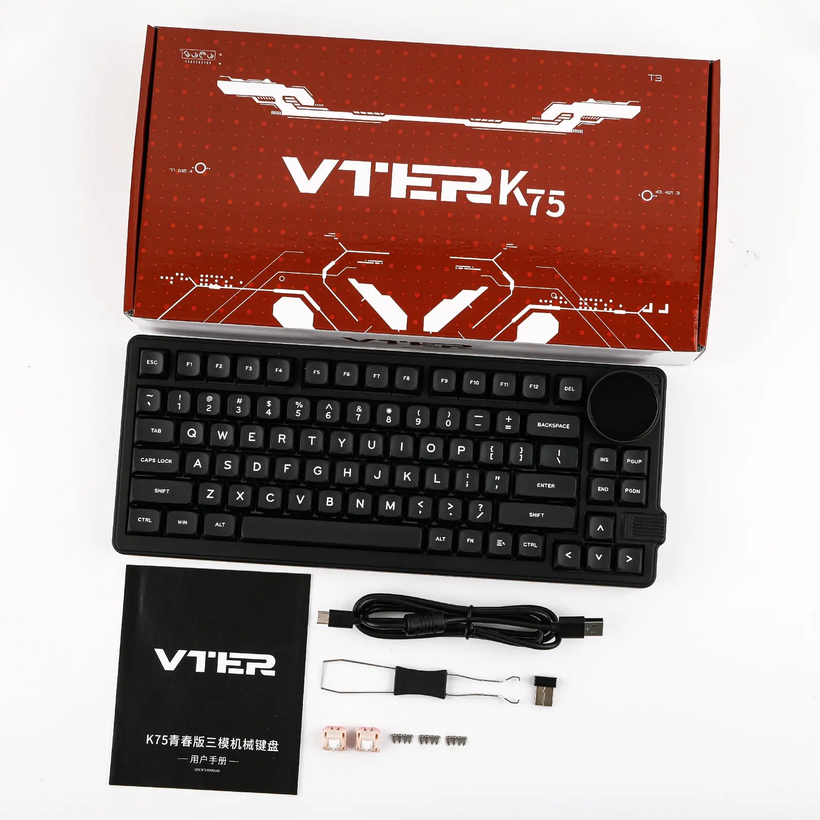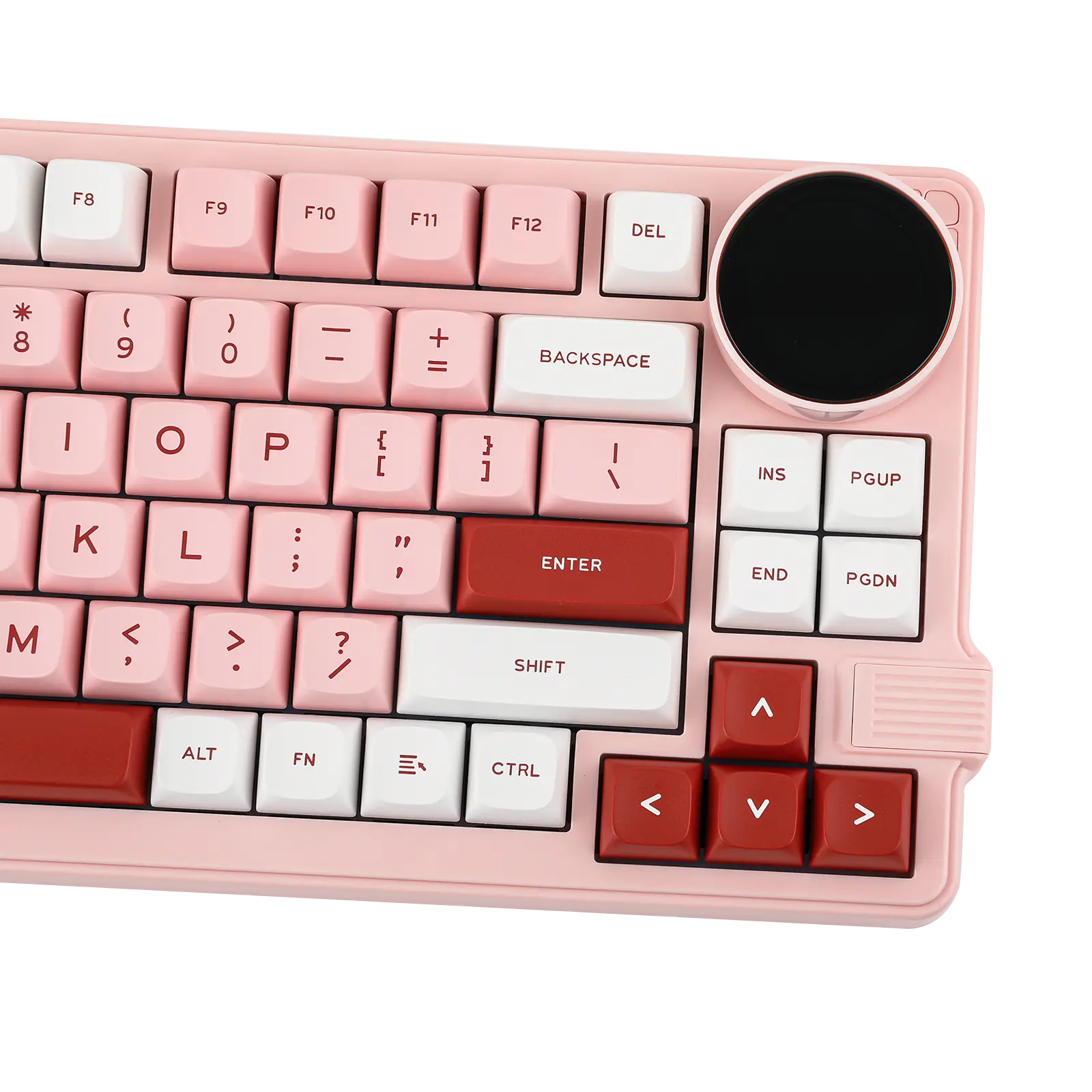 Um teclado 75% super funcional com um botão giratório que serve para ajustar volume, ver status de conexão, bateria e muito mais — direto no display embutido de 1,28". -