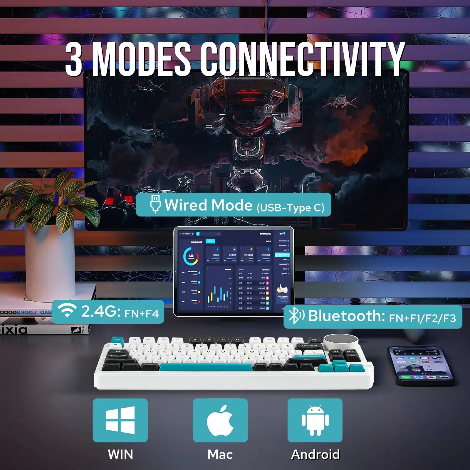 Escolha entre USB-C com fio, Bluetooth 5.0 ou Wireless 2.4GHz. É só plugar ou emparelhar e usar em qualquer sistema: Windows, macOS, tablets e até smartphones. -