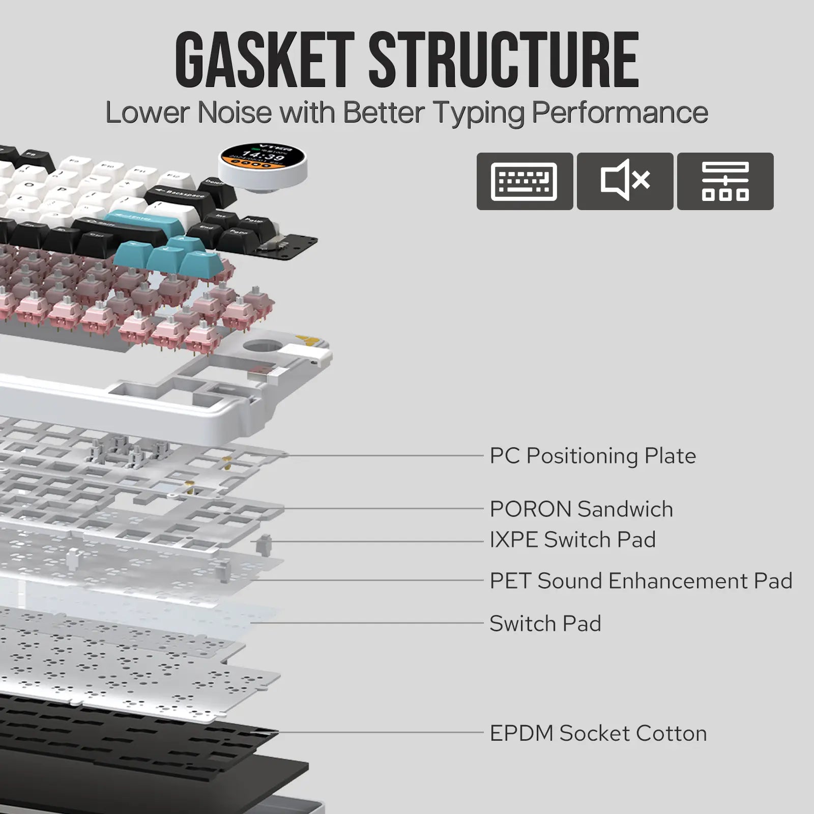 A estrutura interna foi projetada para oferecer uma digitação macia, silenciosa e com sensação premium, graças ao sistema de absorção de som multicamadas. -