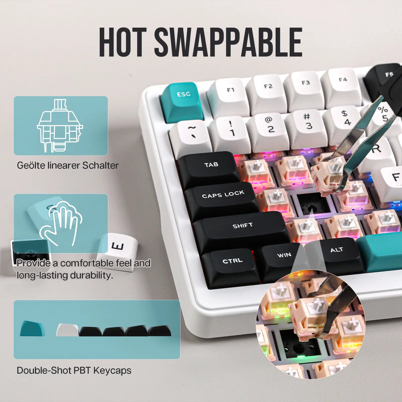 Troque todos os switches com facilidade e sem solda. O teclado reconhece todas as teclas pressionadas, mesmo simultaneamente, garantindo precisão total em games e digitação. -